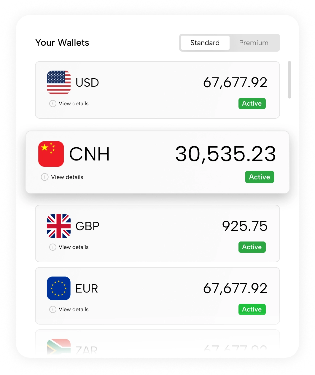 Hold up to 26 currencies in 1 account and access to 5 local rails: AUD, CAD, EUR, GBP & USD