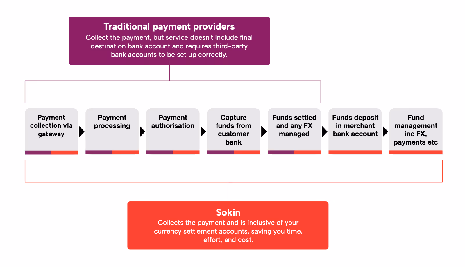 By integrating payment processing and settlement in one platform, Sokin helps online retailers avoid the time and cost involved in setting up foreign bank accounts or working with multiple payment providers. This streamlined approach allows merchants to focus on growing their business, not managing complex financial transactions.